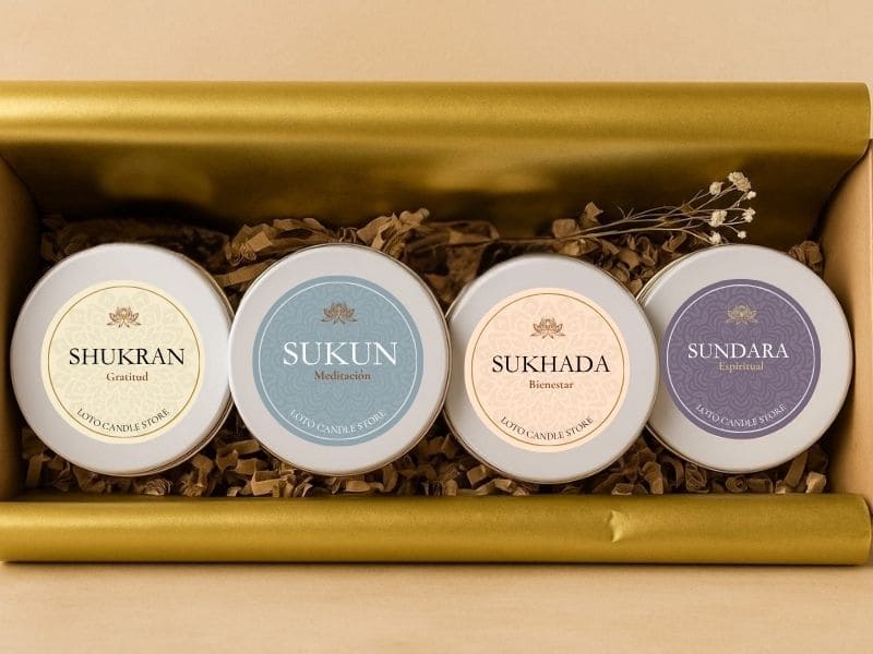 Cada vela representa una intención: Gratitud, Meditación, Bienestar y Espiritualidad, con aromas que elevan tu energía y te invitan a crear un momento solo para ti.