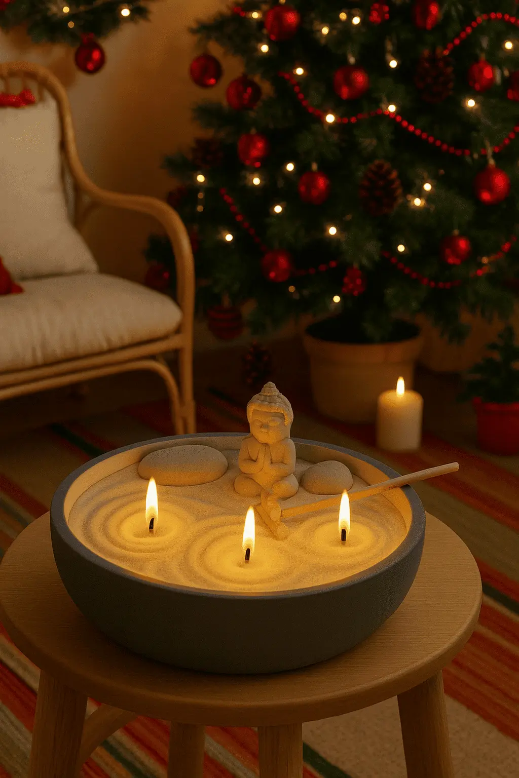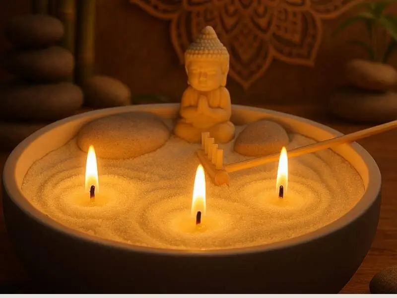 REGALO ORIGINAL: Jardín Zen – Bandeja con vela de arena – Kit de meditación, autocuidado y velas | Cera vegetal + Mechas + Bandeja ecológica + Ritual relajante
