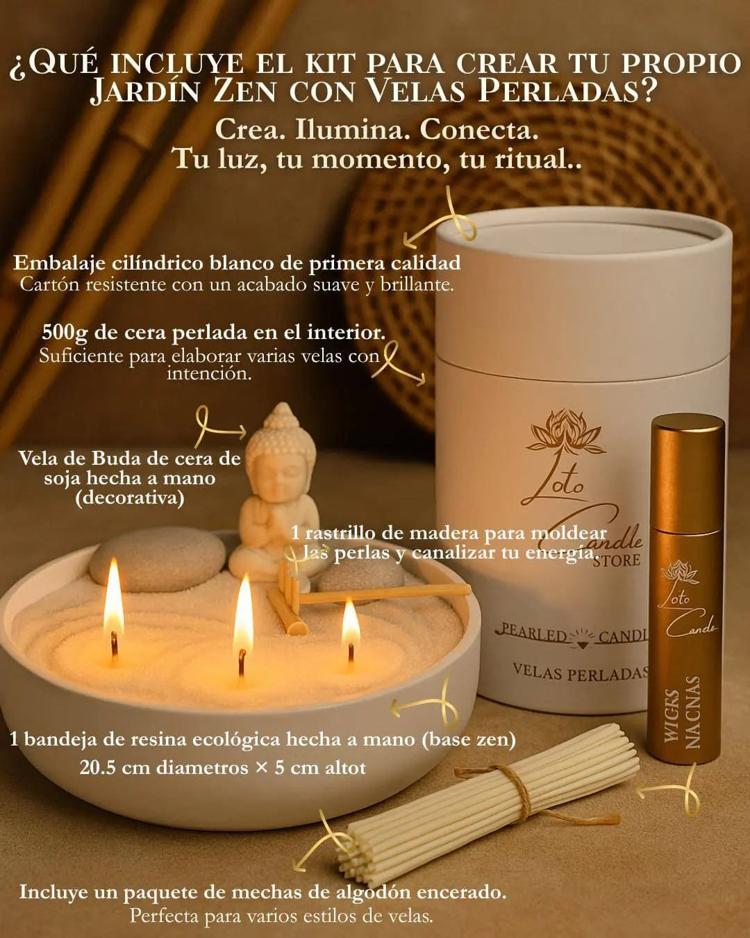 Crea un oasis de calma en tu escritorio, altar o rincón especial con el Jardín Zen con Velas Loto. Un kit terapéutico y artesanal que combina el arte del diseño con la meditación activa a través del fuego, la cera perlada y el movimiento consciente.